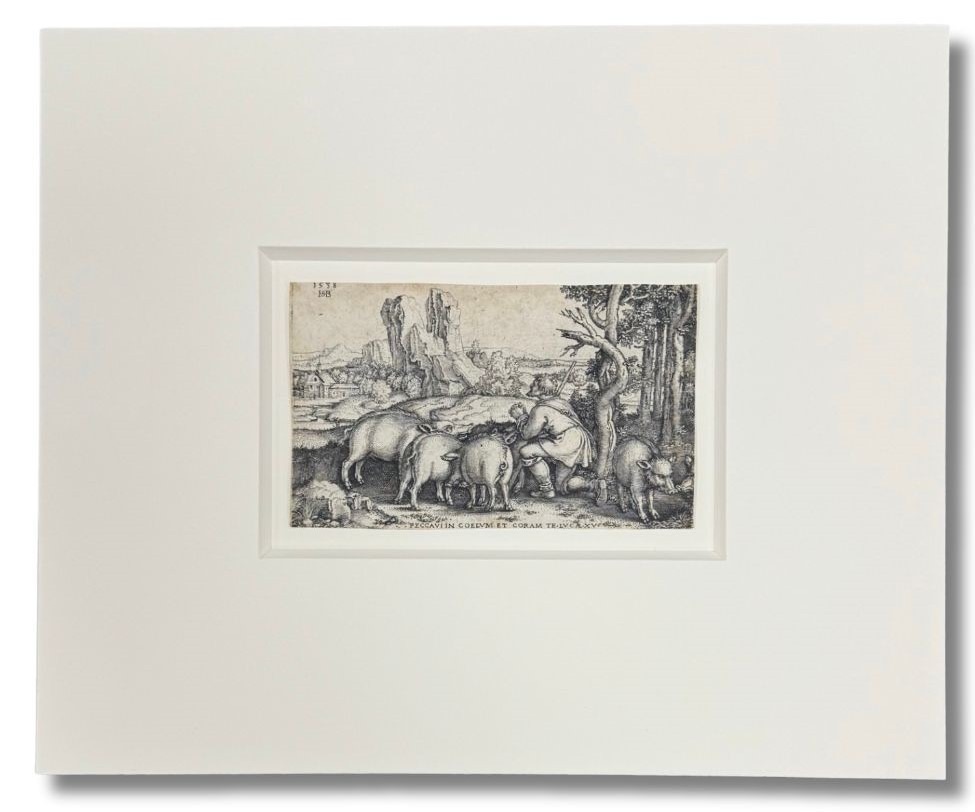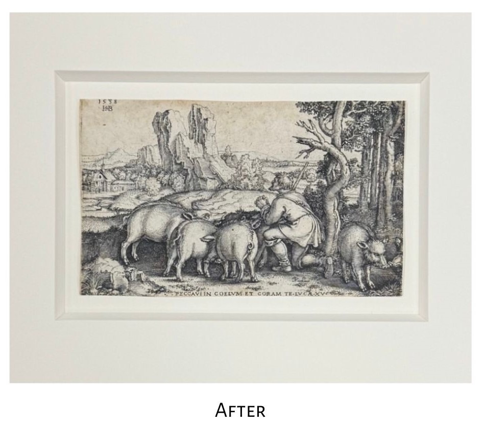 Conservation began with gentle surface cleaning on both sides to lift loose dirt. To address the old hinges and tapes at the top verso corners, a methylcellulose poultice was carefully applied and followed by damp swabbing to release the adhesive without disturbing the fibers. The print was then slowly humidified using a Gore-Tex system, allowing the paper to safely rehydrate and expand in a controlled environment.